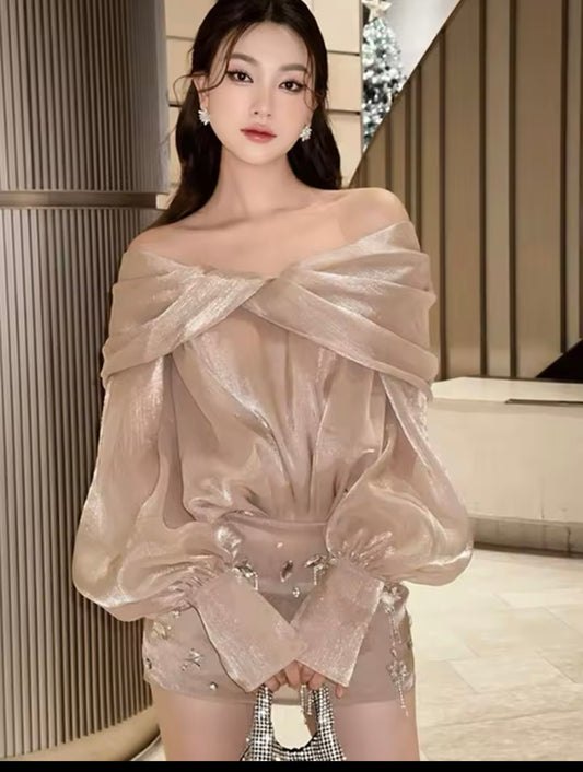 Tan Gold Embellished Off Shoulder Mini Dress Puff Sleeve Off Shoulder Mini Dress Gemstone Mini Dress Formal Dress