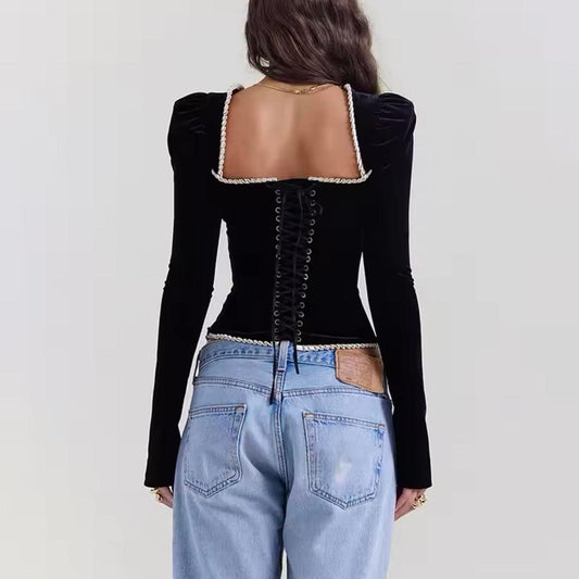 Velvet Black Square Neck Corset Top Black Corset Blouse with Pearls and Puff Sleeves