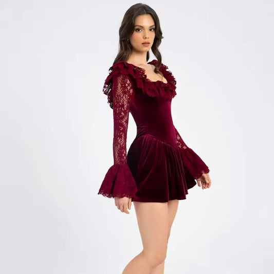 Square Neck Burgundy Velvet Mini Dress with Lace Sleeves and Ruffle Details